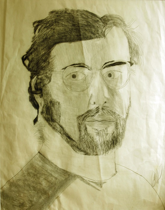 Used India ink and Swiss made watercolor pencils on heavy textured wc paper. Note the elongated shape or “strip.” I used a photo I took of myself, combined with a lovely singer I found on the internet. The paper contained little or no size, or glue, which is added to some paper in order to control the absorption of water. Thus the pigment sinks, into the page.