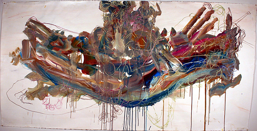 acrylic gouache, colored pencil and white acrylic primer on BFK